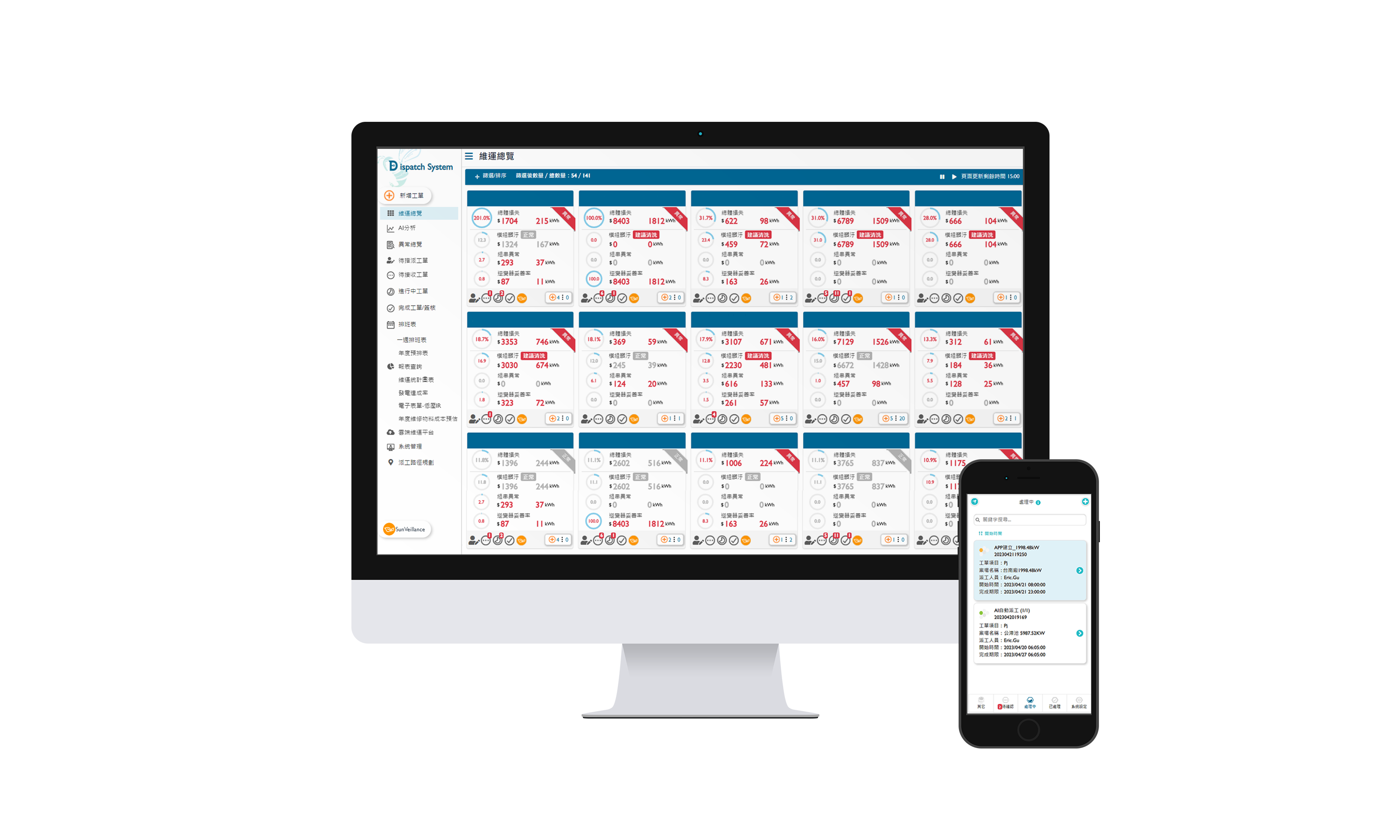 全流程運維管理包括雲端監控工具、AI分析與智慧自動派工及運維APP,實現電廠自主管理。